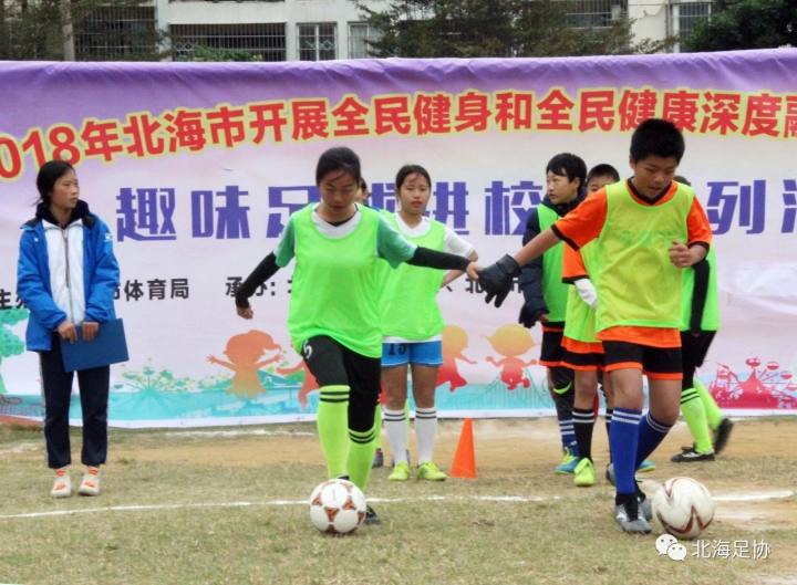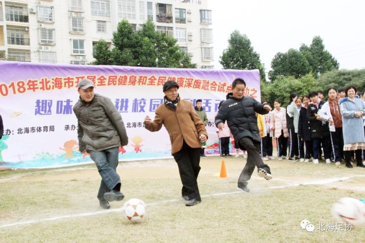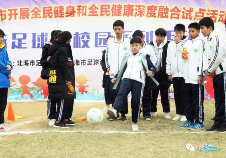 在市体育局的领导下,市足协认真贯彻《广西壮族自治区人民政府办公厅关于加快推动全民健身和全民健康深度融合的指导意见》精神,配合市体育局大力开展2018 北海市全民健身和全民健康深度融合试点活动之趣味足球进校园系列活动,本次活动由市足协党支部书记骆文韬、常务副主席李辉德、秘书长陈小林、裁委会负责人柯志军以及社会足球指导员进行推广,得到了北海九中的大力支持。