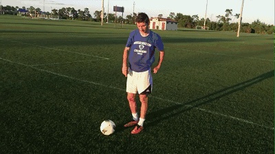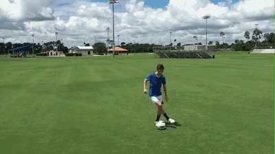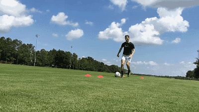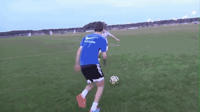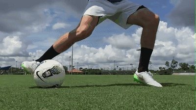 其次,当你成功骗取对方的重心后,用你做假动作那一侧的脚把球拨向另一侧的脚,然后接球脚向前推球,加速趟球离开,这样就是一个漂亮的过人。