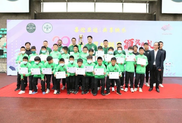 感受榜样的力量,浙江FC一线队队员成颁奖嘉宾,捧场校内联赛,鼓励小队员5月9日上午,第29届足球学校校内联赛颁奖仪式在中泰基地中心场地举行。浙江绿城足球学校校长杨剑、副校长吴剑辉、俱乐部青训总监池谷友良、青训部经理王维晟、多名一线队队员和全体参赛队员参加颁奖仪式。