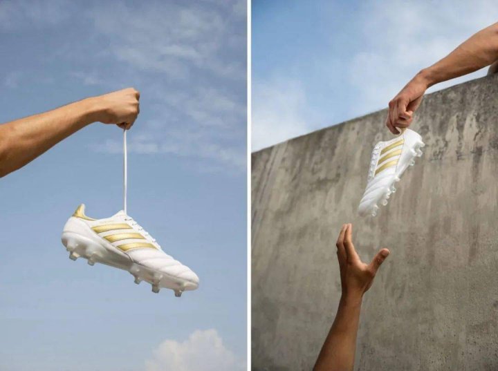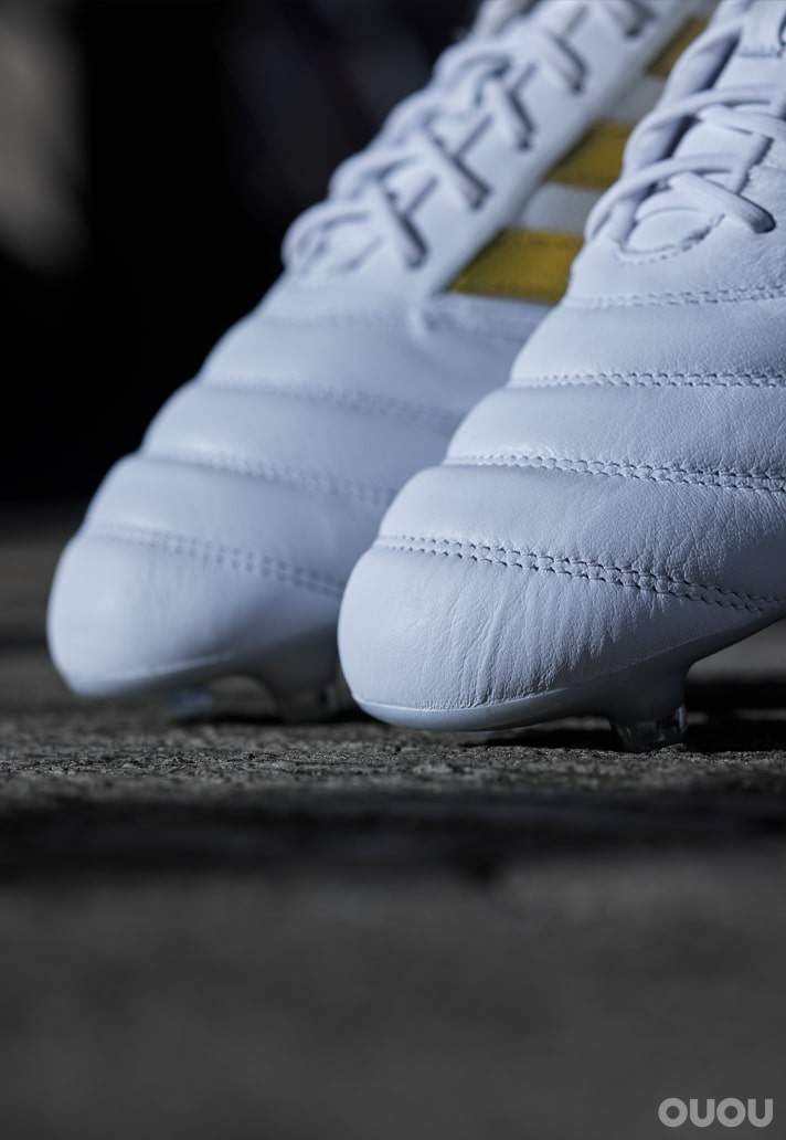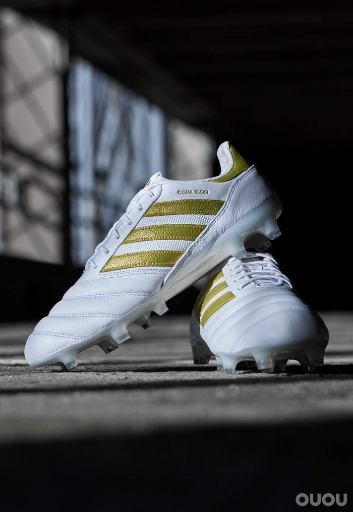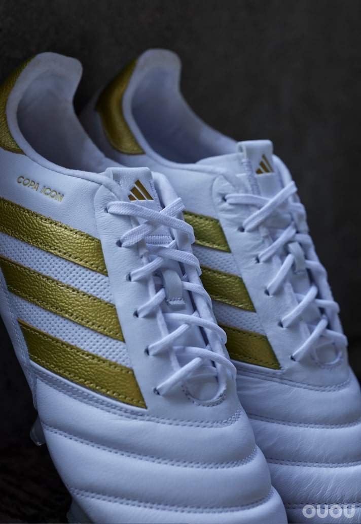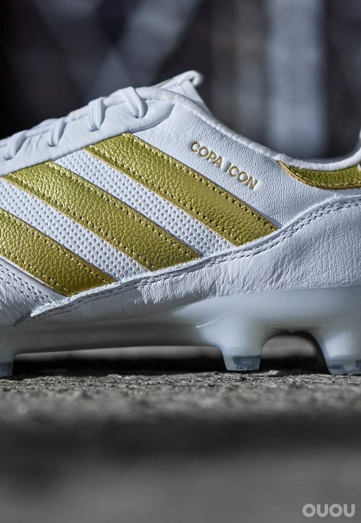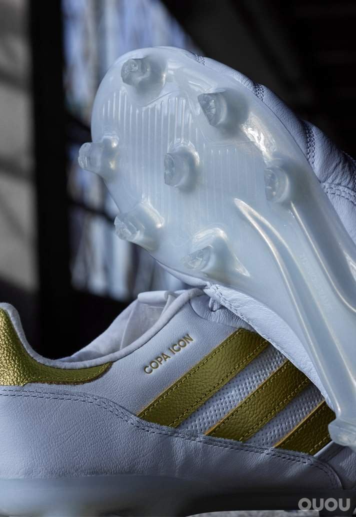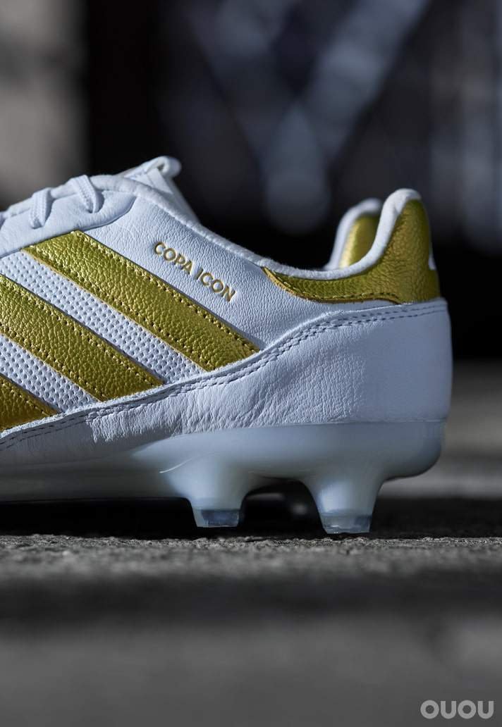 白色鞋面像是一块干净的帆布,通过品牌和侧面的 “copa Icon” 字样,展示了金色的细节。