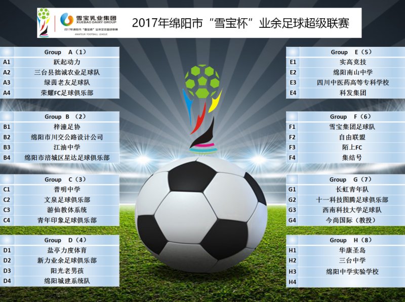 最后,万众期待的抽签正式开始,各个球队负责人都期盼着能抽一支“好签”。根据往届绵阳业余足球比赛的成绩评选出8支种子球队。最终抽签结果如下图: